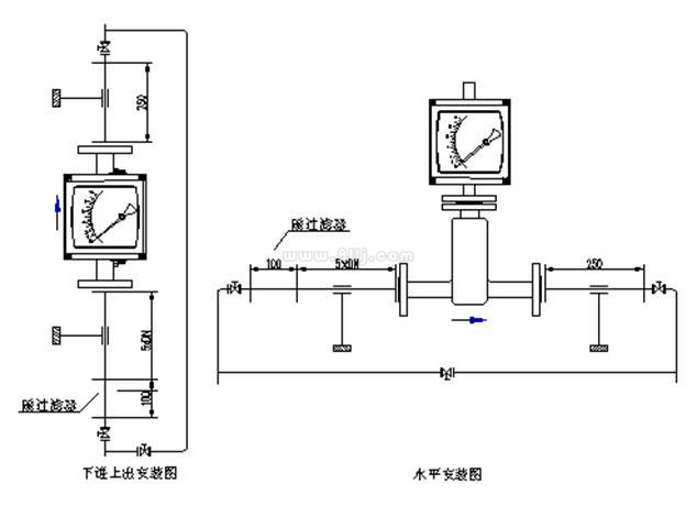 流量計(jì)垂直安裝,流量計(jì)中心線與鉛垂線的夾角不超過5°,在流量計(jì)的上游須保證五倍公稱通徑的入口直管段,下游保證250mm出口直管段。如果介質(zhì)中含有固體雜質(zhì),應(yīng)在流量計(jì)上游加裝過濾器;如果介質(zhì)中含有鐵磁性物質(zhì),應(yīng)在流量計(jì)的上游安裝磁過濾器。為了便于維護(hù)和清洗且不影響生產(chǎn),建議安裝旁通管路。為了避免由于管道引起的流量計(jì)變形,安裝法蘭必須與儀表同軸并且相互平行,并適當(dāng)?shù)刂喂艿酪员苊夤艿勒駝雍蜏p小流量計(jì)的軸向負(fù)荷,測量系統(tǒng)中控制閥應(yīng)安裝在流量計(jì)的下游。用于測量氣體時,應(yīng)保證管道壓力不小于5倍流量計(jì)的壓力損失,以使浮子穩(wěn)定工作。