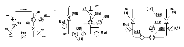 B、C(進出口方位分別為上進下出、下進上出、左進右出)三種流量計安裝管路典型系統圖,以供用戶參考。